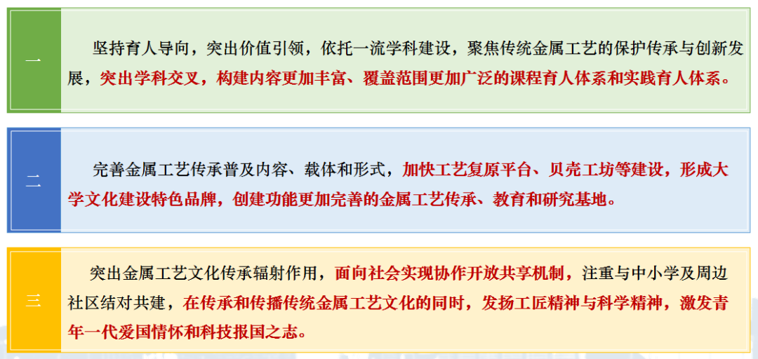 学校已在国家重大文化工程“中华文明探源工程”“指南针计划”的支持下,开展了古代生铁发明创造的系统调查,生铁冶炼工艺复原试验,在传统工艺科学化方面取得了进展。将传统金属工艺的相关课题与设计专业的课堂教学、创意实践和毕业设计相结合,开发传统文化中非物质文化遗产的智能设计,积极探索理工科大学设计专业特色发展之路。